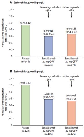 Los pacientes que tenían menos de 300 eosinófilos por microlitro en sangre periférica mostraron una reducción de las agudizaciones en el grupo de tratamiento de 4 semanas (p = 0,0471), y los que recibieron la dosis 8 semanastuvieron mejoras en los síntomas de asma (p = 0,0431). Sin embargo, hay que tener en cuenta que este estudio no fue diseñado para detectar diferencias dentro de este grupo.