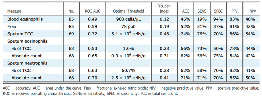 Se diseñaron curvas ROC para evaluar el papel de los marcadores de inflamación de las vías respiratorias como predictores de los defectos de ventilación, utilizando el límite superior de la normalidad (VDP de RMN ¼ 3,7%) como umbral diagnóstico. Las medidas de inflamación incluyeron recuento total de células en el esputo (n = 69, área bajo la curva [AUC] = 0,72), eosinófilos en el esputo (n = 68, % del recuento total de células AUC = 0,53; n = 68, recuento absoluto de células AUC = 0,65), neutrófilos en el esputo (n = 68, % del recuento total de células AUC = 0,63; n = 68, recuento absoluto de células AUC = 0,70), FeNO (n = 85, AUC = 0,59) y eosinófilos en sangre (n =85, AUC ¼ 0,49). El umbral óptimo para la máxima sensibilidad y especificidad que indica ventilación anormal para cada marcador se resume en la tabla 1.