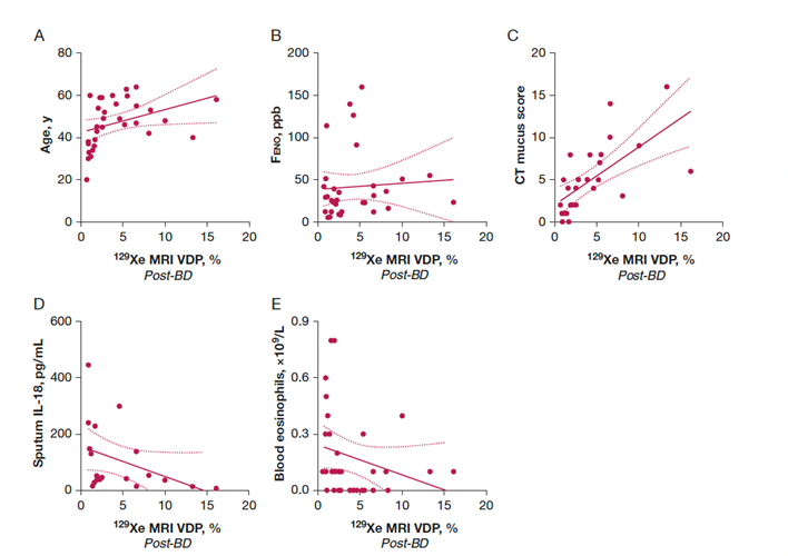 Figura 2: Análisis univariante entre los defectos ventilatorios (VDP) mediante RMN hiperpolarizada con 129Xe en los pacientes con asma paucigranulocítica.